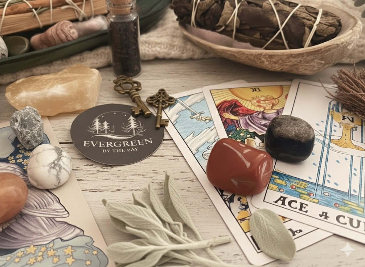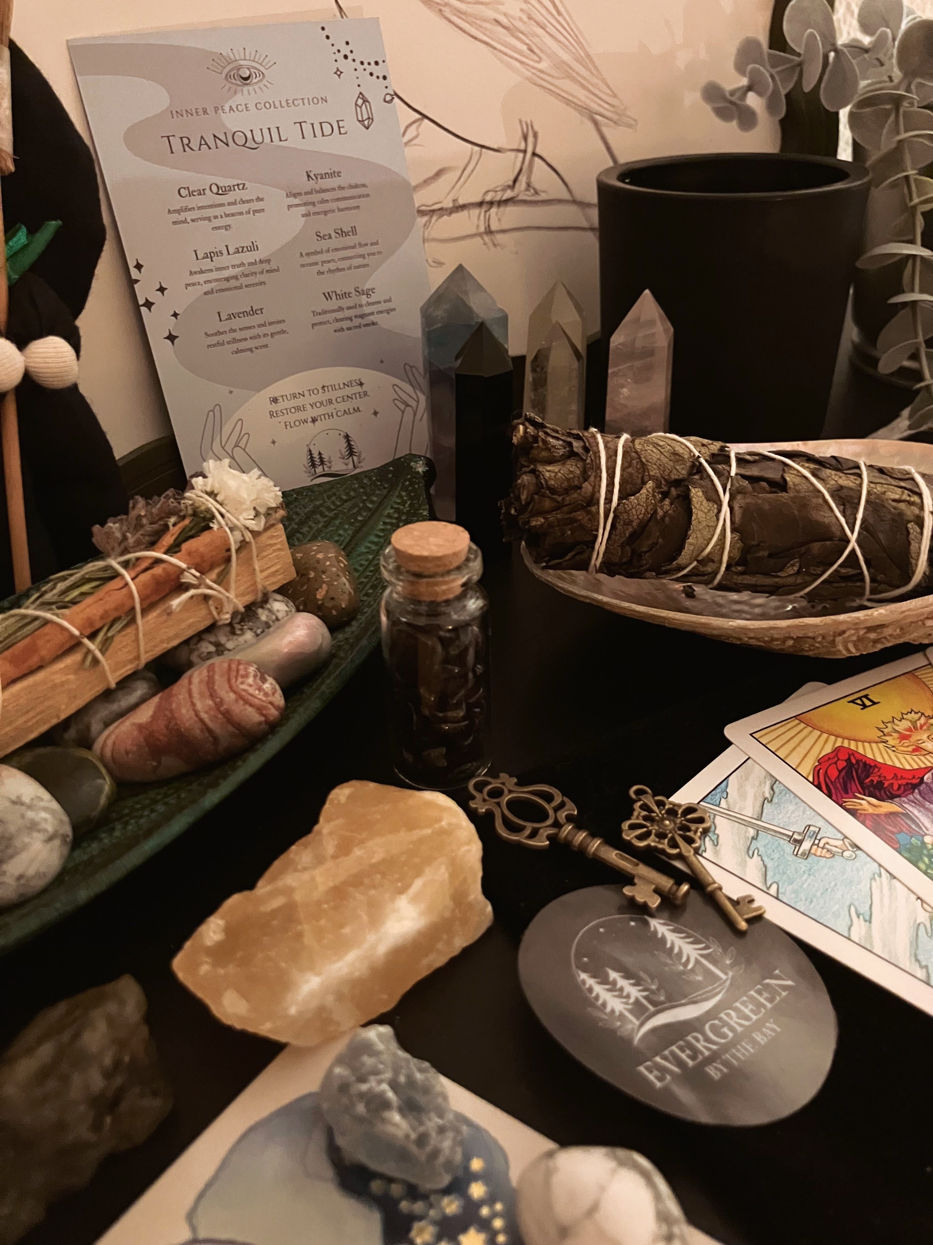 Evergreen by the Bay started as my personal collection of healing stones, charms, and smudges, the very things that helped me feel grounded, calm, and connected, even on the busiest days.
